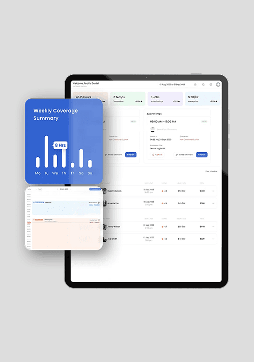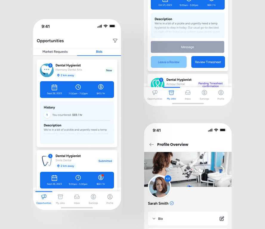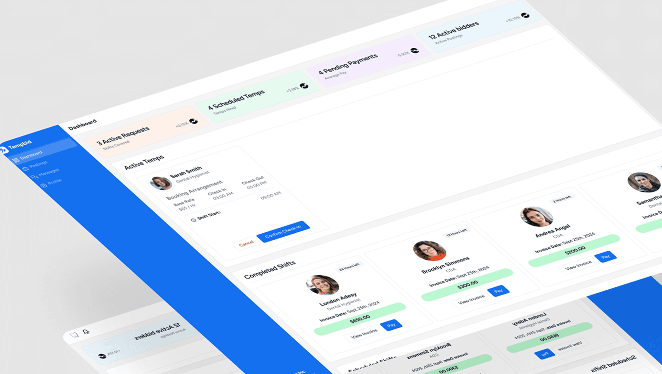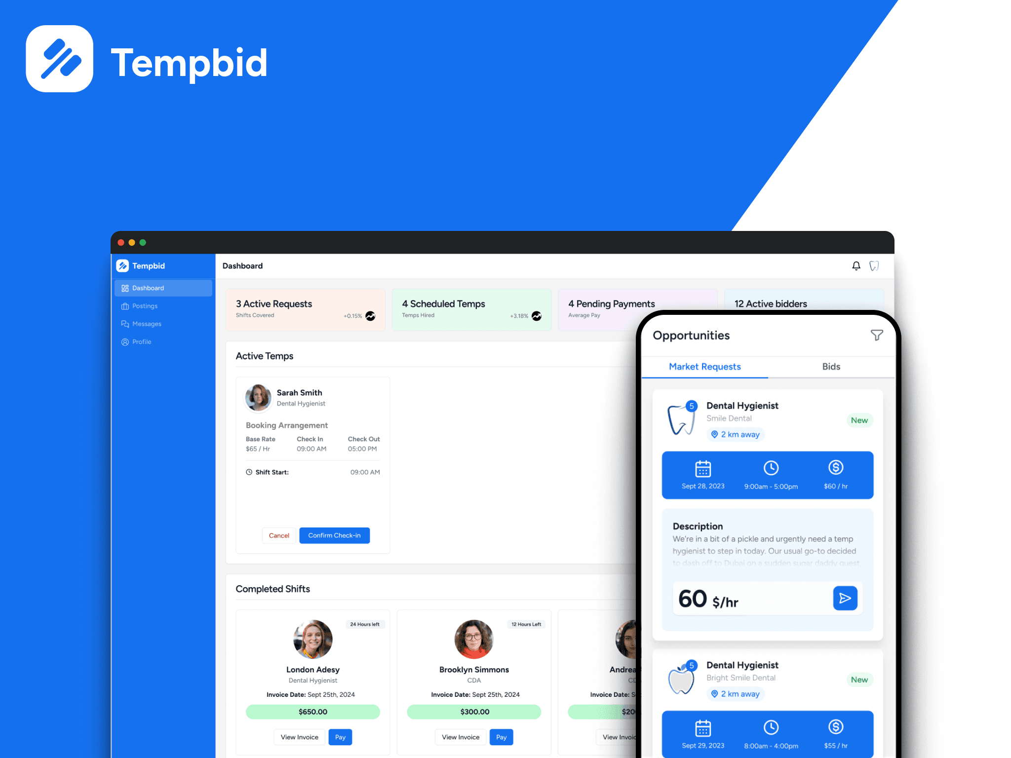 TempbidTempbidisisaadigitaldigitalmarketplacemarketplacedesigneddesignedforforthethedentaldentalindustry,industry,helpinghelpingclinicsclinicsquicklyquicklyconnectconnectwithwithqualifiedqualifiedprofessionalsprofessionalsforfortemporarytemporarypositions.positions.TheTheplatformplatformstreamlinesstreamlinesthetheprocessprocessofofpostingpostingjobjobopportunities,opportunities,browsingbrowsingavailableavailableshifts,shifts,andandmatchingmatchingclinicsclinicswithwithassistants,assistants,hygienists,hygienists,ororadministratorsadministratorswhowhofitfittheirtheirimmediateimmediateneeds.needs.